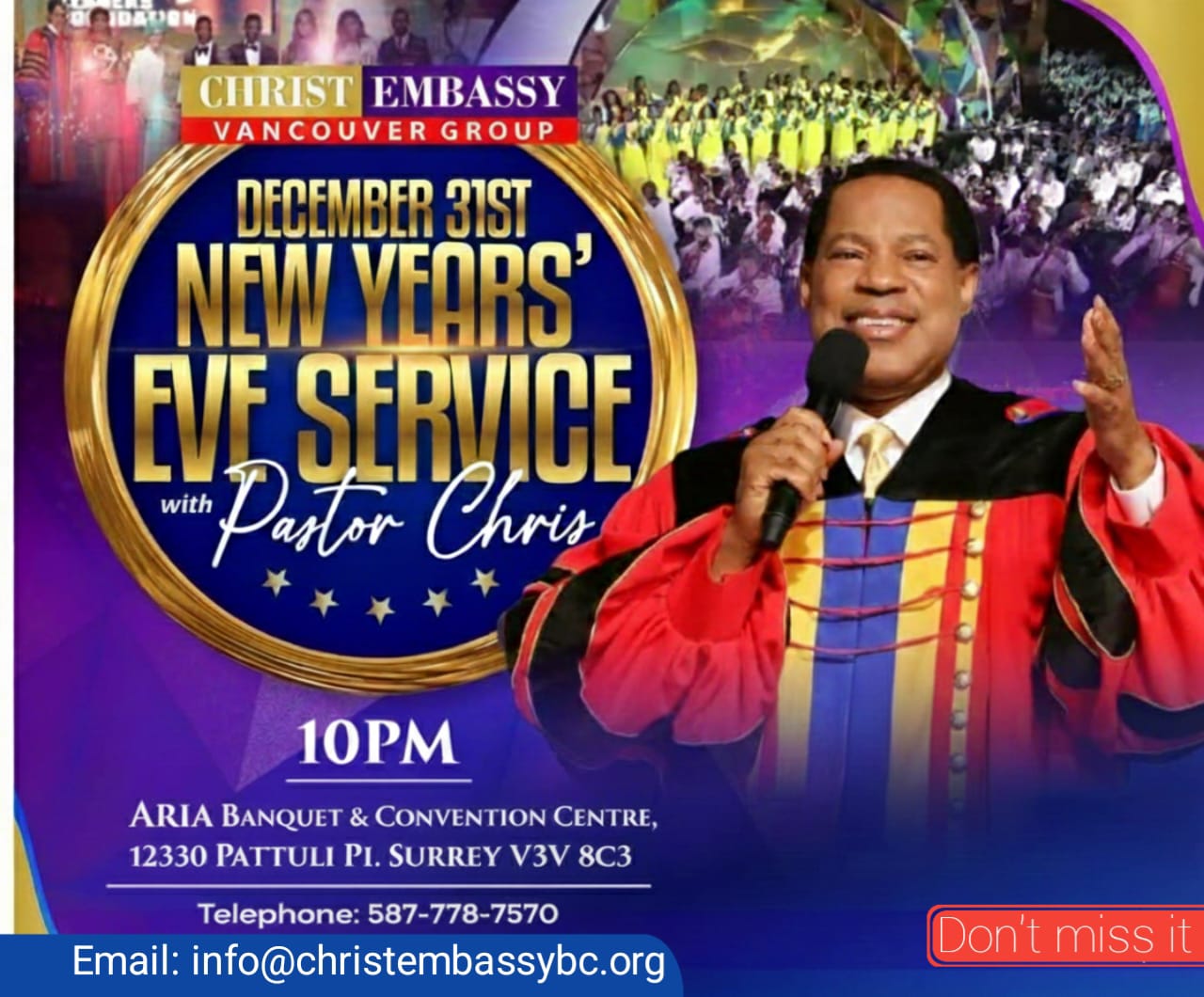 Join believers from across the region for a life-transforming New Year’s Eve Service with Pastor Chris Oyakhilome, hosted by Christ Embassy Vancouver Group.